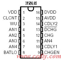 引脚1VDD:该引脚为UCC3957的电源供电输入引脚,输入电压范围为6.5~20V,与电池组的高电位端连接。 引脚2CLCNT:该引脚为设定UCC3957工作在三节或四节电池充电工作状态的引脚。 引脚3WU:该引脚为当UCC3957处于休眠工作状态时,在此脚加信号可唤醒UCC3957进入正常工作状态,此引脚应接到N沟道电平转移MOSFET晶体管的漏极。 引脚4AN1:该引脚为与最高电位的第1节电池的负极及第2节电池正极相连的引脚。 引脚5AN2:该引脚为最高电位的第2节电池的负极及第3节电池正极相连的引脚。 引脚6AN3:该引脚为最低电位的第3节电池的负极及第4节电池正极相连的引脚,当只有3节电池时与电池组的低电位端及AN4引脚相连。 引脚7和11引脚AN4:该引脚与电池组的低电位端相连,并和电流检测电阻的高电位端连接。 引脚8BATLO:该引脚为与电池组的负电位端连接的引脚,同时和电流检测电阻的低电位端相连接。 引脚9CHGEN:该引脚为充电使能引脚,该引脚为高电平时电池组开始充电。 引脚10CDLY1:该引脚为短路保护的延迟时间控制引脚,在该引脚与AN4引脚间连接电容的数值决定过电流的时间,当过电流时控制放电MOSFET晶体管的关断时间,电容的数值也决定打嗝儿过电流保护的时间。 引脚12CHG:该引脚为连接外接可控制N沟道MOSFET晶体管的引脚,而该外接N沟道MOSFET晶体管又可以用来驱动外接P沟道MOSFET管,如果有任一节电池电压高于过电压保护阀值电位,则该引脚相对AN4引脚被置低电位;只有当所有被充电的单节电池电压低于该阀值电位,则该引脚置高电位。 引脚13DCHG:该引脚为用于预防电池过放电的引脚。如果UCC3957内部的工作状态检测器判断到任一节电池处于欠电压状态,则引脚DCHG被置高电位以使外部放电P沟道MOSFET晶体管关断,但当所有电池的电压高于最低阀值电位时,引脚DCHG被置低电位。 引脚14CDLY2:该引脚与AN4引脚之间接一只电容,以延长第二级过电流保护的保护设定时间。 引脚15AVDD:该引脚与为内部模拟电路电源的供电引脚,通过0.1μF电容与AN4引脚相连,正常工作电压为7.3V。 引脚16DVDD:该引脚与为内部数字电路电源的供电引脚,通过0.1μF电容与AN4引脚相连,正常工作电压为7.3V。
